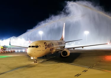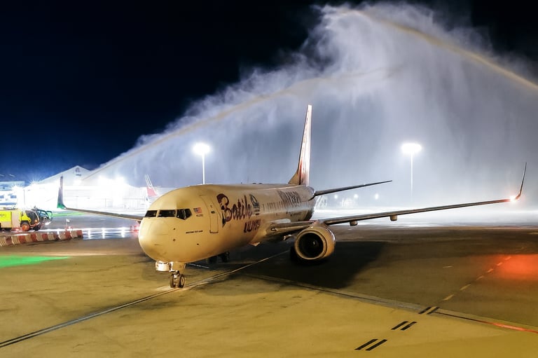 The maiden landing was welcomed with a ceremonial water cannon salute, a polished gesture signalling the beginning of a fresh air link between two of Borneo’s most dynamic gateways.